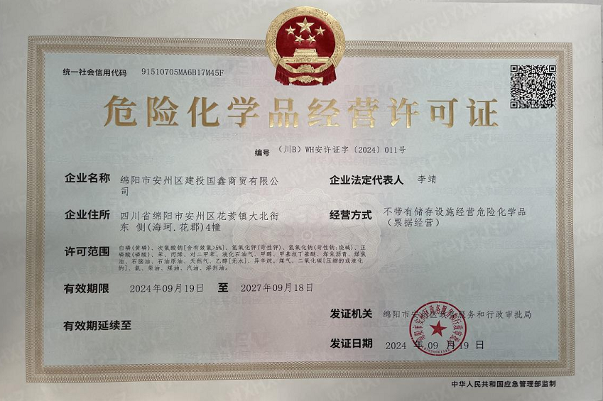 近日,綿陽安州礦產(chǎn)資源集團(tuán)有限公司全資子公司綿陽市安州區(qū)建投國鑫商貿(mào)有限公司(以下簡稱“國鑫商貿(mào)”)順利取得《危險化學(xué)品經(jīng)營許可證》。